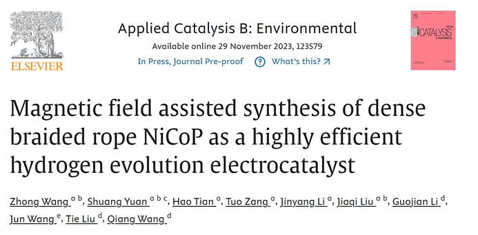 Recently, the research team at NEU focusing on external field control in metallurgy and materials processes published a research paper titled "Magnetic field assisted synthesis of dense braided rope NiCoP as a highly efficient hydrogen evolution electrocatalyst" in the prestigious international journal Applied Catalysis B: Environmental. NEU is the first author institution, with Wang Zhong, a doctoral student from the School of Metallurgy at NEU, as the first author. Professors Wang Qiang and Associate Professor Yuan Shuang are the co-authors.