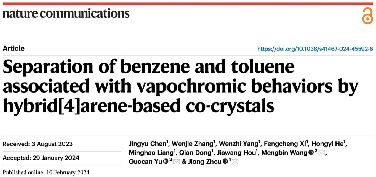 Professor Jiong Zhou’s research group from the College of Sciences,NEU, along with their collaborators, have recently achieved significant breakthroughs in the field of supramolecular chemistry. Their research findings, titled “Separation of benzene and toluene associated with vapochromic behaviors by hybrid [4] arene-based co-crystals”, have been published in the prestigious international journal “Nature Communications”. Jingyu Chen, a postgraduate from Professor Jiong Zhou’s research group at NEU in the class of 2021, is the first author of the paper. NEU is the first completion unit. The corresponding authors are Professor Jiong Zhou from NEU, researcher Guocan Yu from Tsinghua University, and Dr. Mengbin Wang from Zhejiang University.