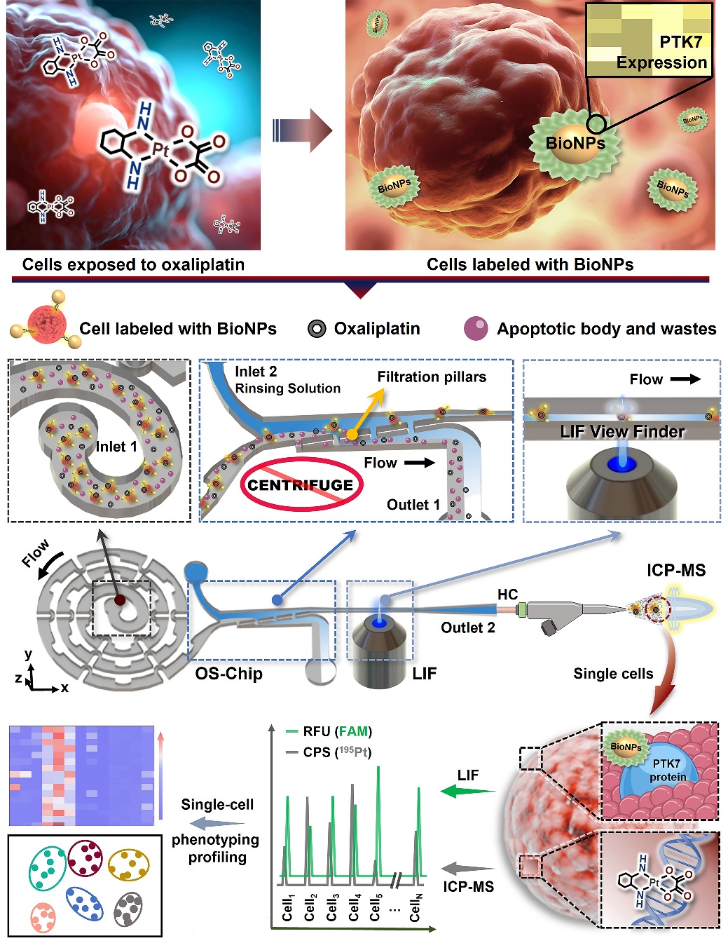To address these issues, the team has developed a series of modular spectral-mass spectrometry two-dimensional single-cell detection platforms. The aptamer-labeled nano-fluorescent probes with high surface area can accurately identify tumor cells expressing specific proteins. Using the self-developed single-cell focusing alignment—sample purification—fluorescence/mass spectrometry sequential detection micro-total analysis (μTAS) chip, we can focus, align, and purify the target cells in complex biological samples, and realize the single-cell high-resolution and high-sensitivity recognition and detection of single cells in two-dimensional mode by laser-induced fluorescence (LIF) and inductively coupled plasma mass spectrometry (ICPMS). This system allows assessment of the association between cellular uptake of platinum-based drugs with induction of PTK7 protein expression at the individual cell level, thereby achieving the phenotypic differentiation of rare tumor cells.