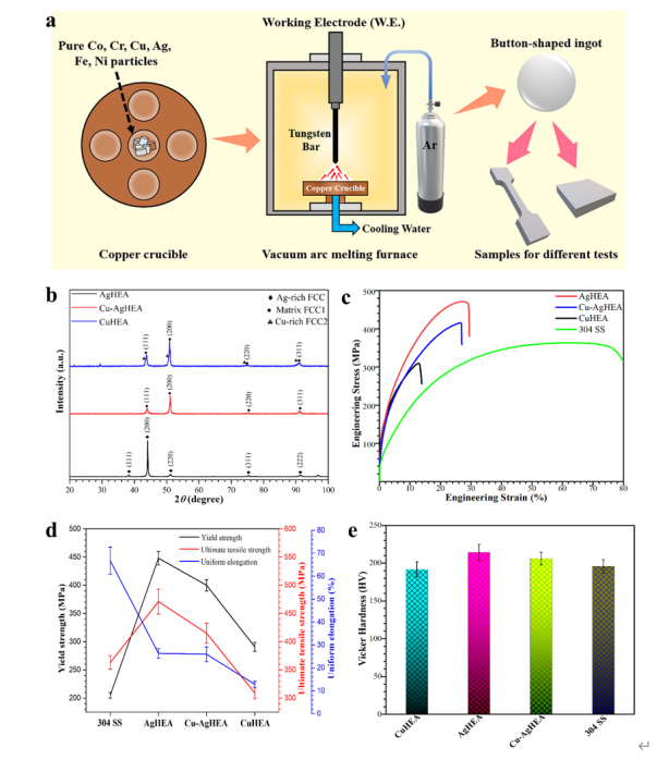 Fig. 1 Preparation (a), organization structure (b), tensile stress-strain curves (c), mechanical property test results (d) and Vickers hardness (e) of high-entropy alloys