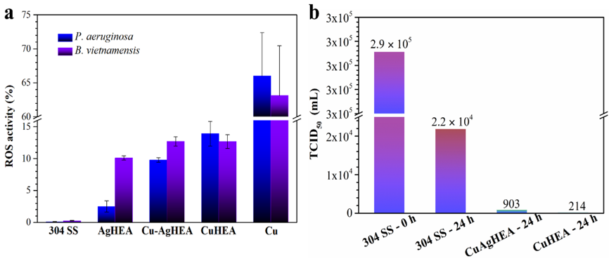 Fig. 2 ROS yield (a) and resistance to the COVID-19 virus (b) after co-cultivation of high-entropy alloys with microorganisms