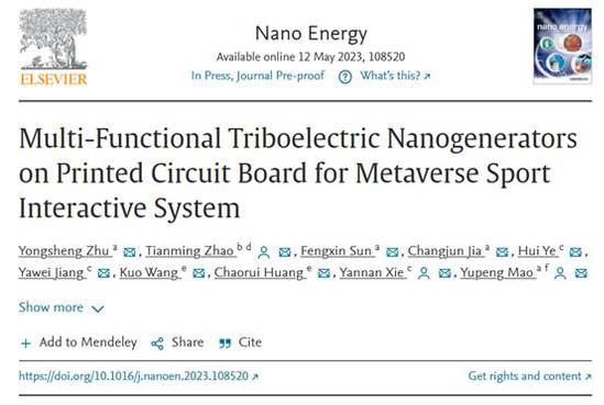 Recently, the paper of associate professor Mao Yupeng’s research group, titled Multi-Functional Triboelectric Nanogenerators on Printed Circuit Board for Metaverse Sport Interactive System, was published in the internationally renowned journal Nano Energy (Q1, CAS, Impact Factor 19.069). NEU is the first unit and corresponding unit, postgraduate student Zhu Yongsheng is the first author, and associate professor Mao Yupeng is the corresponding author of the paper.