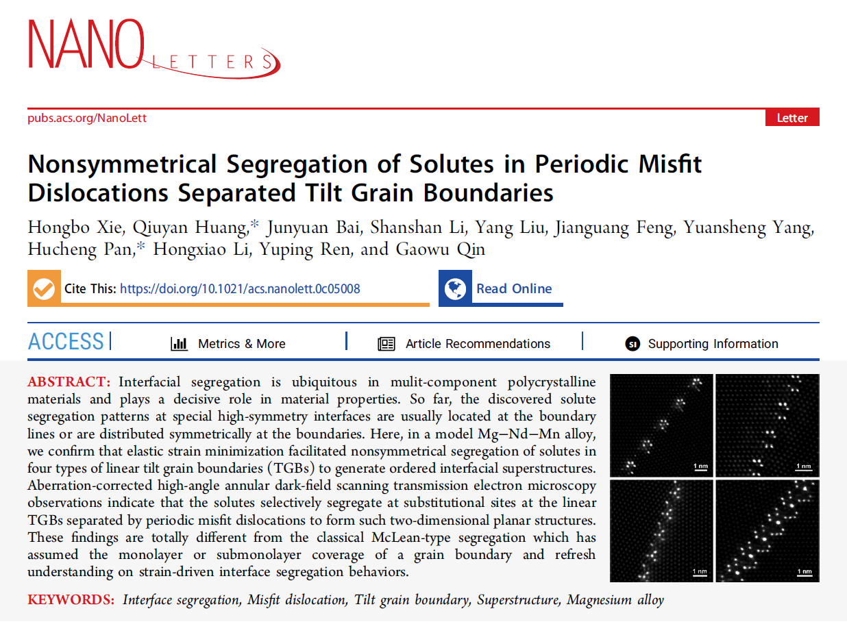 Recently, a research paper,Nonsymmetrical Segregation of Solutes in Periodic Misfit Dislocations Separated Tilt Grain Boundaries by professor Qin Gaowu’s team from the School of Material Science and Engineering of NEU and researcher Yang Yuansheng from the Institute of Metal Research of CAS has been published online in Nano Letters. In this study, the HAADF-STEM  technique for spherical errors correction combined with molecular dynamics simulation is used to reveal the ordered segregation behavior of solute atoms at grain boundaries.