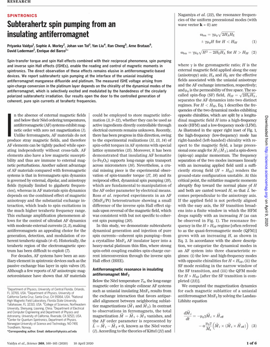 The antiferromagnet has an oscillation frequency in the order of terahertz compared to that of the ferromagnetic material in the order of gigahertz, which gives the antiferromagnet a natural advantage in the generation, detection and modulation of ultra-high frequency signals. However, since the antiferromagnet is difficult to detect because it usually displays a state of zero net magnetic moment. The paper provides a method for detecting the antiferromagnetic oscillation signal by combining the anti-ferromagnetic spin pumping effect with the anti-spin Hall effect, and experimentally measures the spin current produced by an insulating antiferromagnet MnF2 under the effect of the high-frequency polarized microwave field. Their results not only verify the theoretical prediction of the existence of subterahertz spin pumping from an insulating antiferromagnet, but also open the door to the generation of spin current at terahertz frequencies.