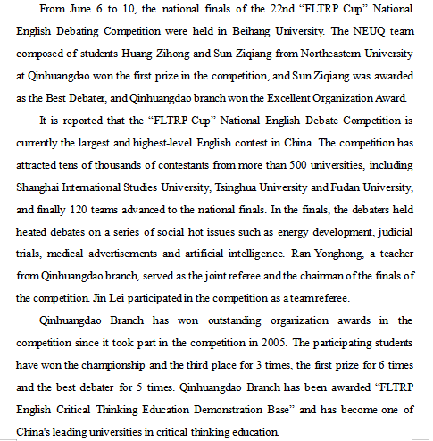 Students of 太阳成集团tyc33455cc中国官网 at Qinhuangdao Won the First Prize of the 22nd FLTRP Cup National English Debating Competition