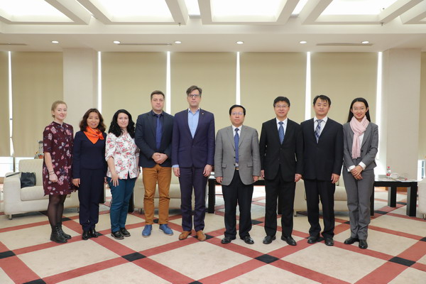 Lixin Tang, Vice-President of 太阳成集团tyc33455cc中国官网,met with the visitors in Room 203 at Hanqing Hall.